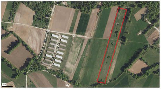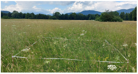 The studied flat meadow is located at 297.51 metres above sea level (46°06′37.0″ N, 14°29′05.7″ E). It spans 2 hectares and is classified as a dry meadow [49]. It is oriented from north to south, in the shape of a long rectangle. It is 28 metres wide at its widest point. In some parts, there are also small communities of shrubs (Figure 2). The bedrock of the researched meadow is limestone, on which undeveloped riparian soil was formed due to deposits of gravel from the nearby Sava River [50]. The soil pH ranges from 7.5 to 8. At its edges, the meadow is bordered by a small deciduous forest and agricultural areas. These are intensively cultivated meadows and grain fields. On one of the neighbouring abandoned fields, there is also a large stand of invasive plant species Solidago canadensis L. and Erigeron annuus (L.) Pers. According to our observation of grazed plants, animal sleeping places and animal faeces, it is obvious that wild animals are also using this meadow as their living space.