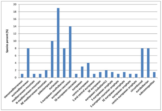 So far, we recorded a total of 163 plant species on the dry meadow in Roje on the outskirts of Ljubljana (Table 1). Of the recorded species, as many as 18 are on the list of protected plant species in Slovenia [54]. Among them are Galanthus nivalis L., Gladiolus illyricus and Lilium bulbiferum L., and 15 species of orchids. Among the species present are the species typical of dry meadows with shallow soils (Anthericum ramosum, Veronica barrelieri subsp. nitens, etc.) and species typical of wetter soils (Astrantia major L., Epipactis palustris (L.) Crantz, Calluna vulgaris (L.) Hull, etc.). Primarily moisture-loving plant species appear on the meadow in small patches. Peucedanum oreoselinum (L.) Moench and Cirsium pannonicum (L. f.) Link are uniformly present in the central part of the meadow, Anthericum ramosum and Veronica barrelieri subsp. nitens primarily in the southern part, and Allium carinatum subsp. carinatum L. and Cichorium intybus L. primarily near the field path that crosses the meadow. There is also a larger population of Gladiolus illyricus in the eastern central and southern parts. Solidago canadensis and Erigeron annuus can also be found, especially on the eastern edge of the meadow, posing a risk of spreading from the nearby abandoned field. Most of the species present on the meadow have Eurasiatic distribution (19%), slightly lesser (14%) European Caucasian and paleotemperate distribution (10%). Species with a eurimediterranean, southern European–southern Siberian, circumboreal and Eurosiberian distribution are also represented with 8%. Species with other distribution types represent less than 4% (Figure 4). Within the meadow, there are also islands of scrub vegetation Prunus spinosa L., Cornus sanguinea L., Corylus avellana L., Crataegus monogyna Jacq., Euonymus europaeus L., Frangula alnus Mill., Ligustrum vulgare L., Sambucus nigra L. and Viburnum opulus L.