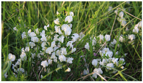 As expected, the studied meadow is predominantly covered by species with the Central to Southern and Eastern European chorotype. Slovenia lies at the transition between Central, Southern and Eastern Europe, and the studied meadow actually already lies in the pre-Alpine geographical region [46]. For this reason, the presence of some species characterised by one of the five Mediterranean types of distribution is definitely interesting [52]. For example, the subspecies Veronica barrelieri. subsp. nitens Host with a north-eastern Mediterranean-mountain chorotype is present in the part of the meadow with the shallowest and sandiest soil. The subspecies grows primarily on dry, sunny, sandy and stony soils on calcareous grasslands in the sub-Mediterranean, Dinaric, sub-Pannonian and pre-Alpine regions [9,61,62]. This subspecies even has its locus classicus along the Sava River near Ljubljana, i.e., in the area where this meadow is located. The subspecies was described by N. T. Host in 1827 as Veronica nitens, namely on the basis of specimens sent to him by the then-head of the University Botanic Gardens Ljubljana, Franc Hladnik [63]. Hladnik collected the specimens on meadows by the Sava River. Considering that the subspecies is still present on this meadow, it indicates that traditional management has allowed for the preservation of the species from 1827 in at least some areas. In addition to subspecies Veronica barrelieri subsp. nitens, there is also the species Chamaecytisus purpureus with a similar type of distribution, also growing in shallow and dry locations. It represents a remnant of the association of pine forests Pinetum-Genistetum januensis, which once grew also on the terraces of the Sava River, where the studied meadow is located [44,45]. The flowers of Chamaecytisus purpureus appear in this meadow in shades of colour ranging from pinkish–white to dark pink, which indicates a large intra-species variability in the population present on the meadow. In 2013, we also found well-developed specimens with white flowers on the meadow for the first time [64,65] (Figure 7). Again, in the shallowest sandy southern section of the meadow, there are also three species of orchids (Anacamptis coriofora, Anacamptis pyramidalis (L.) Rich. and Neotinea tridentata) whose area is primarily in the Mediterranean region. Anacamptis coriofora, which is characteristic of higher altitudes in the Mediterranean [66], otherwise occurs in Slovenia mainly in southern and south-western Slovenia [67,68], while A. pyramidalis is predominantly a Western European-Mediterranean species [66]. Another plant that has its locus classicus in Slovenia (around Idrija) is Neotinea tridentata [69,70], with its area extending all the way from North Africa through the Mediterranean to England [66]. In the same part of the meadow where the previously mentioned species were present, we also observed the presence of species Inula hirta L. for the first time during the survey in 2023. The species is characteristic of dry meadows, sunny and rocky slopes with shallow soils [61,71] and has a locus classicus in Slovenia (Mt. Nanos) [69] on the border between the sub-Mediterranean and Dinaric regions. Similarly, Onobrychis viciifolia is also found here, but it has its locus classicus in dry meadows around Senožeče [69,70]. The next species with the locus classicus in Carniola in Slovenia, Sanguisorba minor [69], also originates from dry meadows.