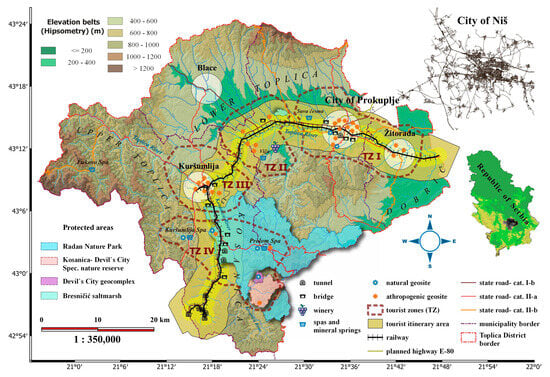 - Ivanović, M.; Lukić, T.; Milentijević, N.; Bojović, V.; Valjarević, A. Assessment of geosites as a basis for geotourism development: A case study of the Toplica District, Serbia. Open Geosci. 2023, 15, 20220589. [Google Scholar] [CrossRef]