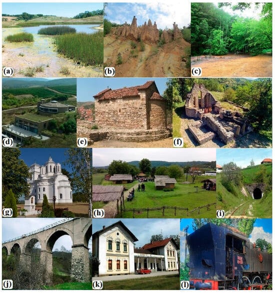 Some touristic values along the abandoned railway. (a) NV—Bresničić Saltmarsh; (b) NV—Devil’s Town; (c) NV—Devil’s spring (in Devil’s Town); (d) AV—“Toplica Vineyard” Winery; (e) AV—Latin Church in Prokuplje; (f) AV—Monastery of the Holy Virgin; (g) AV—Monastery of the Holy Archangels Michael and Gabriel; (h) AV—archaeological site Pločnik (Neolithic settlement); (i) TA—tunnel; (j) TA—"viaduct” bridge; (k) TA—railway stations in Kuršumlija; (l) TA—old locomotive. Source: authors.
