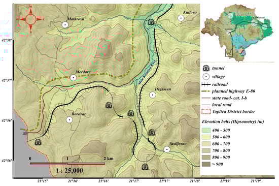 The basis of this research is the single-track regional non-electrified railway number 223, running on the route Niš (Doljevac)–Prokuplje–Kastrat (Kuršumlija)–Merdare–Kosovo Polje, with branch 222 (Kuršumlija–Kastrat). The railway passes through three local spatial units in the Toplica District (Žitoradja, Prokuplje, and Kuršumlija). The Toplica District is an administrative region situated in the southern part of Serbia in the valley of the Toplica River, covering an area of approximately 2231 km2 with a population of 77,341. The railway traverses 35 settlements, including two urban centers—Prokuplje and Kuršumlija—with a combined population of 46,722 inhabitants (60% of the district population) and indirectly connects over 200 settlements within its wider zone. According to OECD criteria, all the mentioned local spatial units are classified as rural areas. Based on the Decree on the Establishment of a Unified List for the Development of Local Self-Government Units in Serbia [60], the local self-governments in this district are classified as underdeveloped and extremely underdeveloped/devastated. Prokuplje is categorized as an underdeveloped local self-government, while the municipalities of Kuršumlija and Žitorađa are classified as extremely underdeveloped and devastated. Historically, the railway served as a vital strategic link, connecting Kosovo and Metohija (KaM) with the Pan-European Corridor X and facilitating the connection of two regional centers, Priština and Niš [63]. However, during the 1999 war in KaM, the “Merdare” tunnel, crucial for connecting Toplica District with the area of KaM, was disabled and has not been restored since. Train traffic was suspended, and subsequently, freight and passenger traffic were limited to the Niš (Doljevac)–Merdare route, often interrupted due to maintenance and repair work on the railway. In recent years, flash floods in 2020 damaged certain sections of the railway, causing occasional disruptions in rail traffic. Presently, the railway is abandoned, with no operational train services. While the infrastructure may appear neglected and dilapidated, field research confirms that trains can still operate along most of the route. Basic traffic signals are in place, and the bridges and tunnels are structurally sound and functional. However, a partial reconstruction and modernization of the railway is necessary to ensure unrestricted use in the future. Since its initial construction, the railway has not undergone reconstruction; only ongoing maintenance has been carried out. The maximum permitted speed is 60 km/h [63]. Existing planning documents outline its modernization and electrification [64], but these plans have not been realized even a decade after their adoption.