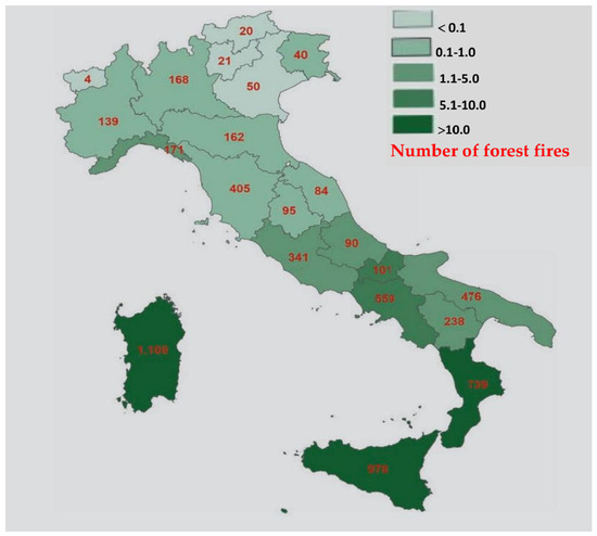 Forest area covered by fires per 1000 square kilometers and in red the number of fires, Source: Figure 13. Elaboration of SDGs 2023 Report on data from the Comando Carabinieri Tutela forestale (accessed on 10 September 2023).