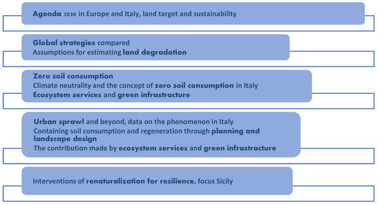 We aim to understand the relationship between the factors that contribute to making the territory resilient by improving environmental and energy performance and urban quality standards through actions and measures to contain land consumption, de-waterproofing, and sustainable use. The map (Figure 2) summarizes the methodological path used for the general exploration of the themes and of the emerging orientations through the review of the literature and the state-of-the-art; we focus on the objectives of Agenda 2030 in Europe and in Italy [8,10,11,12,13,18,19,20,21,22,23] and on sustainability targets for the landscape. From the comparison of global strategies emerge the strategies in place to monitor and preserve the soil and the trend structures towards irreversible consumption. The discussion intervenes in the relationship between climate neutrality objectives and zero land consumption in Italy and the relationship and role of ecosystem services. The analysis of the results leads to defining some assumptions: the phenomenon of sprawl is not easy to contain, the containment of land consumption can be implemented through integrated regeneration strategies, and ecosystem services contribute to landscape planning. The discussion follows with a focus on renaturalization interventions in Sicily and the conclusions with future implications or expected results.