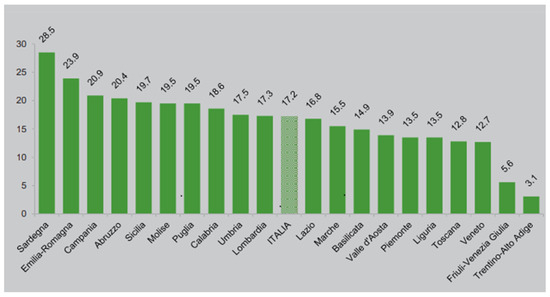 Percentage share of regional degraded land net of water bodies (UNCCD methodology for SDG 15.3.1 indicator) year 2019. Source: Ispra and SDGs Report 2023, ISTAT, Rome (accessed on 10 September 2023).