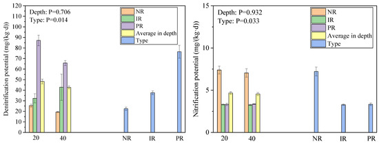 The potentials for nitrification and denitrification in the urban river–riparian interface. Depth indicates the significance of the differences at various soil depths, type signifies the significance of the differences among the different revetment types, NR is the natural revetment, IR is the impervious revetment, and PR is the permeable revetments.