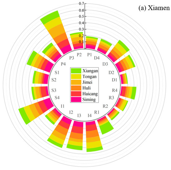 In terms of the distribution range, the obstacle degree of the driving force layer, pressure layer, and response layer in the XZQR are concentrated in specific areas. However, the obstacle degree of the pressure layer is the largest, and the obstacle degree of the pressure layers differs between different counties. The obstacle degree of the pressure layer caused by the natural environment has fewer variations and the differences are mainly related to human activities. The distribution of the state layer’s obstacle degree is the most concentrated, indicating that the differences in the obstacle degree of the state layer between regions are slight. At the same time, two concentration areas of the state layer’s obstacle degree exist: Xiamen and Quanzhou have a higher obstacle degree of the state layer, while Zhangzhou has a lower obstacle degree of the state layer.
