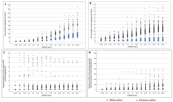 Figure 4. (A) Area of each mapping unit of 15 alternatives for ATMUs; (B) River length in each mapping unit of 15 alternatives for ATMUs; (C) Standard deviation of per capita GDP in each mapping unit of 15 alternatives for ATMUs; (D) Number of POIs for government organizations and social groups in each mapping unit of 15 alternatives for ATMUs.