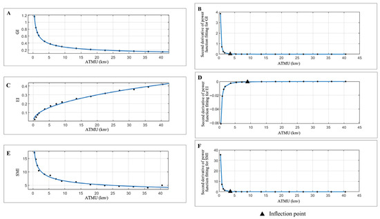 Figure 5. (A) Fitting power function for GI; (B) Second derivative of power function fitting for GI; (C) Fitting power function for EI; (D) Second derivative of power function fitting for EI; (E) Fitting power function for SMI; (F) Second derivative of power function fitting for SMI.