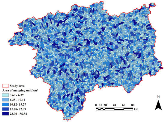 According to Equation (7), the OATMU for CES in the Qiantang River Basin was determined to be 3.60 km2. When the ATMU was 3.60 km2, the GI was 0.4592, the EI was 0.1383 and the SMI was 6.6596. There were 4910 mapping units in the OATMU dataset, of which the area of mapping units smaller than 6.37 km2 accounted for 46.74% of the total. The mapping units between 6.38 km2 and 10.11 km2 accounted for 29.04%. The mapping units between 10.12 km2 and 15.27 km2 accounted for 15.58% (Figure 6).