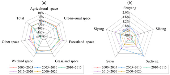 The transformation intensity of the “territorial space” in Suqian City was measured according to its degree of dynamic change. The first concept measured was the intensity of each type (Table 2). From the absolute values of the dynamic degree of various “territorial space” types, the changes in the “territorial space” in Suqian City from 2000 to 2020 were presented as follows: grassland space > urban–rural space > forestland space > agricultural space > wetland space. Except for the maximum values of the dynamic degrees of grassland and other ecological spaces that appeared in 2015–2020 and 2010–2015, respectively, the maximum values of other cover types were reached during 2005–2010. Secondly, the intensity of each period was measured. The comprehensive dynamic degree of the “territorial space” in Suqian City over the 20 years study period was 0.45%, among which the value during 2015–2020 was the highest, and the value during 2000–2005 was the lowest. This indicates that the “territorial space” transformation in Suqian City has been the most intense over the past five years. The third measurement was the intensity of each region. From the comprehensive dynamics of each prefecture-level administrative region in the past 20 years, Sucheng District experienced the greatest change characteristics, followed by Siyang County, Suyu District, Shuyang County and Sihong County, all of which exceeded 0.25%. During 2015–2020, the comprehensive dynamic change characteristics of “territorial space” in each county exceeded 0.6%, and Sucheng District and Suyu District exceeded 1% during 2005–2010, indicating that their “territorial space” transformation was more intense during these periods (Figure 2).