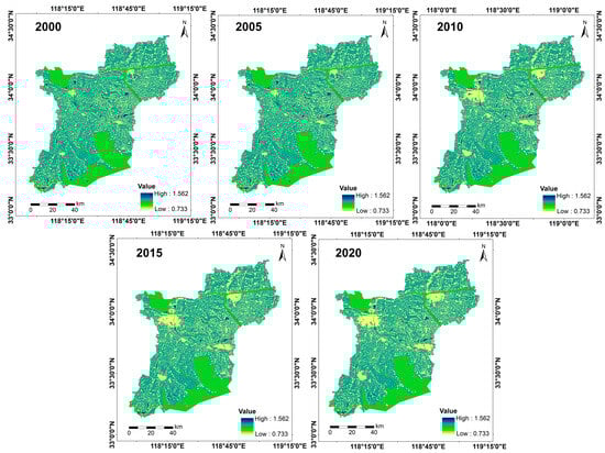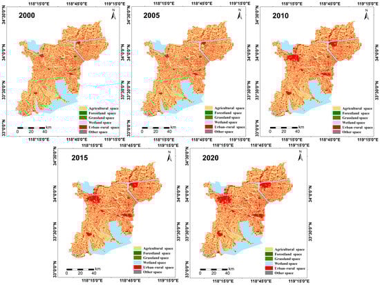 According to the territorial space status map of Suqian in 2000, 2005, 2010, 2015 and 2020 (Figure 3), the main types of territorial space in Suqian are agricultural and urban–rural spaces. The southwest and northwest parts of Suqian belong to the hilly and ridged area, where forestland space is widely distributed. Fruit trees are mainly grown in the southwest, while the northwest is rich in forest resources. Agricultural space is mainly distributed in the vast plains, with the northeast being a rice-producing area, the southeast being an area where aquatic products and rice intersect, and the central region being an important producer of flowers and plants. Grassland spaces depend on rivers and lakes and are sparsely distributed in wetland areas in the northwest and southeast, along riverbanks and hills. The urban–rural space is concentrated in the central urban area, and there is an obvious clustered structure in Suyu District and Sucheng District. Residential areas are consistently associated with agricultural spaces and are widely distributed in the central and eastern regions. Wetland space is mainly located in the Jing–Hang Canal—Ancient Yellow River Ecological Zone, which runs through the city’s central region, including various water systems such as Luoma Lake and Hongze Lake in the southwest and southeast, as well as the Huaihong Xin River and Liutang River.