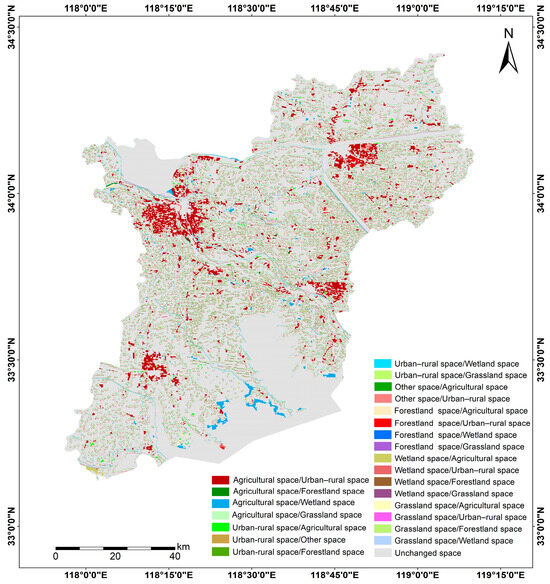 - The conversion between agricultural space and urban–rural space in Suqian City was the largest from 2000 to 2020, with urban–rural space occupying 684.42 km2 of agricultural space. The area of wetland space showed a stable growth trend, while forestland space exhibited a continuous decline.