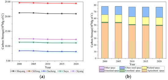 Regarding changes in different counties (Figure 5a), the overall carbon storage levels in the different counties of Suqian City demonstrated a slight yet stable downward trend. Sihong County had the largest carbon storage value, with values of 24 Tg or more maintained at all stages, followed by Shuyang County. Carbon storage levels in Suyu District and Sucheng District were relatively low. The carbon storage levels of the five counties showed a tendency toward decline from 2005 to 2010, which slowed in the other stages.