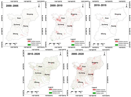 Between 2000 and 2020, Suqian’s carbon source areas were concentrated in northern Sucheng District, urban centers in Shuyang County, northern Sihong County, eastern Siyang County and along the Hongze Lake Coast, and some carbon source areas were scattered around the residential areas in the city. Carbon storage was reduced by 17.63 km2, or 0.21% of the total area, mainly in western Sucheng District, Central Shuyang County, and the southwest coast of Hongze Lake, and the slight reduction in carbon storage accounted for 9.22% of the total area. Carbon sink areas were mainly distributed in the southwest and northwest hilly areas, with some scattered around the towns and riverbanks. The carbon sink area increased significantly, accounting for 0.13% of the total area. The area of carbon storage increased slightly, accounting for 330.53 km2 or 3.88% of the total area. The area of carbon storage was mainly distributed in the southeastern boundary of Sihong County and Santaishan National Forest Park. The carbon balance area was still widely distributed in the central and eastern parts of Suqian, with an area of 7376.78 km2, accounting for 86.56% of the total area.
