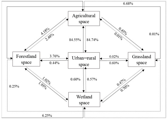 From 2000 to 2020, urban–rural space was the main hotspot of territorial spatial transformation. Urban–rural space was mainly converted from agricultural space, with a conversion rate of over 95% from 2000 to 2005, 2005 to 2010 and 2010 to 2015. The conversion rate throughout the entire period from 2000 to 2020 was 96.86%, which was much higher than that in other spaces. The expansion of urban–rural space mainly encroached on agricultural space, followed by water bodies and wetlands and forest, with areas of 684.42 km2, 13.57 km2 and 7.11 km2, respectively.