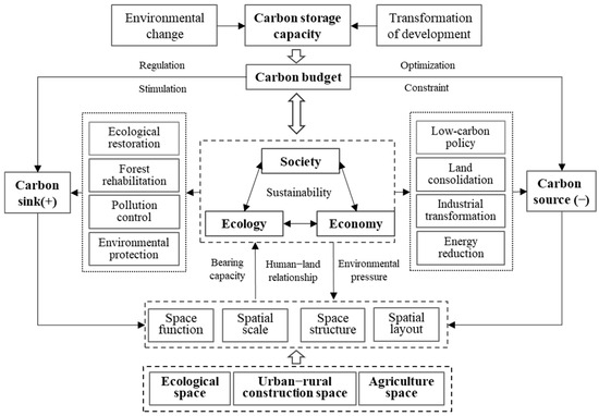 The transformation of the territorial space refers to the application of land transformation theory in the research of new era territorial governance. The essence of territorial spatial transformation is the mapping of the spatial evolution of the human–earth relationship [11]. With the developing society, people’s basic needs exist within a relational hierarchy encompassing survival, safety the pursuit of material wealth and satisfying spiritual needs. Therefore, as the process of ecological awareness grows in a civilization, people tend to optimize production space and urban space through technological progress and efficiency gains, to maintain and improve the scale, structure and function of ecological space to support high-quality regional economic and social development. In the relevant theoretical research applying the low-carbon concept in territorial spatial transformation, scholars identify the carbon source/sink function of different types of land use, such as forests, wetlands and industrial land [12,13,14]. Earlier research has been carried out on the carbon balance of land use and the optimization of low-carbon territorial space, the results of which have been widely used in practice, but it has mainly focused on the scale and structure of land use. Further research is needed on the transformation of territorial space patterns and how they affect carbon storage.