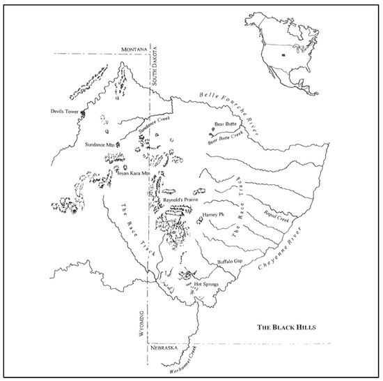 From a Native American perspective, Mateo Tepe is an iconic geological feature and thus an example of what some anthropologists call a self-voiced protuberance. Dramatically rising from a flat high plains landscape containing a major river, from a human perspective, it is the most visible and important component of the topography for hundreds of square miles. This conclusion is attested to by the various culturally derived social constructions of its formation, meaning, and subsequent appropriate management recommendations [4,5,34]. Sundstrom [3] argues that the sacred sites of the Black Hills are perceived by Native American people as reflecting the pattern of falling stars. After 1890, Amos Bad Heart Bull drew a sacred geography map of the Black Hills region including Mateo Tepe. Nickolas Black Elk, a well-known Oglala Lakota holy person, recorded a series of the ancient Falling Star accounts in the 1930s and 1940s. In these Lakota accounts, Falling Star is a hero who travels through the Black Hills, has adventures, and visits the seven Star Villages, which are associated with the Pleiades or the Big Dipper. These villages occur both on Earth in the Black Hills and in the Heavens [3] (Figure 4). Places and events in the two dimensions are mirrored.