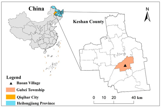 Keshan County in Heilongjiang Province, China, is located on the southern edge of the Lesser Khingan Mountains and the northern part of Songnen Plain (Figure 3). It has a temperate continental monsoon climate with an average annual temperature of 2.4 °C, and most of the rain falls between June and August. The deep and nutrient-rich black soil is suitable for the growth of various crops, making it dominated by traditional agriculture, with the main crops including corn, soybeans, potatoes, and rice. Hence, Keshan County becomes a key national commercial grain base. In order to further improve the agricultural and rural industrial structure and increase farmers’ income, combined with the research results on the layout optimization of cultivated land utilization in Keshan County, Heilongjiang Province, in 2018 [40], towns and villages were used as the specific implementation units for the cultivated land utilization layout adjustment, and stable rice production areas, corn and soybean rotation areas, corn advantageous areas and soybean advantageous areas were respectively established.