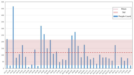 Spatial form and human behavioral data were collected in Mochou Village to comprehensively analyze the spatial patterns and characteristics of human behavior in the region. Spatial data were collected from field survey maps and project design documents, including street networks, property boundaries, and the built public space environments. The key spaces were abstracted into 23 nodes (Figure 2). Simultaneously, video surveillance data of passenger flows were retrieved for 4 days in 2020: October 24th, 25th, 31st, and November 1st. The video images were extracted at one frame per minute for each camera point, and the number of tourists was observed and recorded. The average of the total statistical data of the four days was calculated to obtain the average daily tourist flow value of key spaces in the village (Figure 3 and Figure 4).