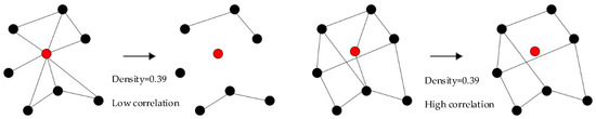 Network stability is not determined by connection density. Figure 7 illustrates that in two networks with the same density, if there is increased density due to a core node, that network collapses when the core node is removed, indicating poor stability. The lambda sets can be used to evaluate the overall stability of a network structure through analysis of the line connectivity at various levels [65]. The connectivity between any two nodes in the lambda sets is greater than that between any two nodes within or outside the sets. Therefore, a higher lambda value with a larger proportion of nodes indicates greater network stability. Edge connectivity is defined as the minimum number of edges required to disconnect two nodes in a network. A higher edge connectivity value indicates a stronger relationship between the two nodes.