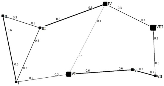 The tourism activity-based network was analyzed using the CONCER algorithm with a maximum cut depth of 3 and a concentration standard of 0.2. As a result, the block model analysis of the Mochou Village activity-based network identified eight sub-blocks, as shown in Table 1, along with the corresponding sub-blocks density matrix in Table 2. The previous calculations indicated that the overall density of the activity-based network in Mochou Village was 0.1423. Sub-blocks densities equal to or greater than 0.1423 signify higher density than the overall level, suggesting a concentration trend within the sub-blocks [67]. Values in the sub-block’s density matrix equal to or greater than 0.1423 were denoted as 1, while values less than 0.1423 were denoted as 0. This conversion results in a succinct relationship matrix (Table 3). A diagram illustrating the relationships between the eight subgroups was created based on this matrix (Figure 8), with larger nodes representing increased human flow interaction within sub-blocks, and thicker lines indicating more frequent human flow interaction between sub-blocks. Figure 8 shows frequent human flow interaction among external sub-blocks, but with uneven link strength. Internal relationships within sub-blocks reveal that IV, VI, and VIII have significantly higher density scores, indicating clear activity centers in these areas of Mochou Village, while the remaining sub-blocks exhibit relatively weaker activity. In conclusion, Mochou Village offers a diverse and uneven spatial layout for plaza nodes, demonstrating multi-centered and heterogeneous characteristics, enriching the flow rhythm and spatial experience for tourists through the analysis of the vitality characteristics of the public space network in Mochou Village.