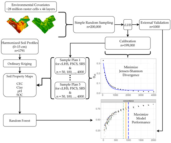 Flowchart of the workflow utilized in this study showing the sampling of the environmental covariates, the repeated (five times) sample plans of increasing size selected with conditioned Latin hypercube (cLHS), feature space coverage sampling (FSCS), and simple random sampling (SRS), the calibration and external validation of the random forest models for cation exchange capacity (CEC), clay content, pH, and soil organic carbon (SOC), and the minimization of the Jensen–Shannon divergence. Detailed steps are explained in Section 2.3, Section 2.4, Section 2.5, Section 2.6 and Section 2.7.