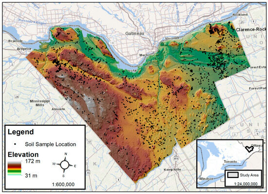 Map of the Ottawa study area in eastern Ontario, Canada, with elevation from the digital terrain model (DTM) and small dots representing the 1791 soil sampling locations. The DTM is draped over a hillshade with 10× exaggeration to highlight the topography and landforms. Inset map shows the location of the study site in relation to southern Ontario, Canada.