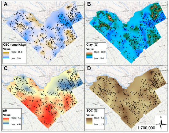 Kriged surfaces of (A) cation exchange capacity (CEC), clay content (B), soil pH (C), and (D) soil organic carbon (SOC) with thinned sample locations (black dots) for the Ottawa study area.