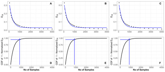 Exponential decay of the Jensen–Shannon divergence (DJS) and cumulative distribution function for determining optimal sample size as a function of sample size for the conditioned Latin hypercube sampling algorithm (A,D), simple random sampling (B,E), and feature space coverage sampling algorithm (C,F). Solid lines in plots (A–C) show the curve fitted uses non-linear least to square the DJS to the points that represent the DJS at the various sample sizes. Vertical solid lines in plots (D–F) highlight the optimal sample size determined where the cumulative distribution function reached 95%.