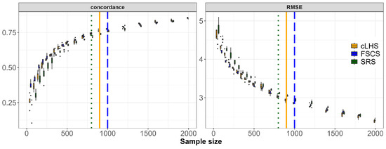 The model performance metrics as a function of sample size (learning curves) from the external validation of the RF models are provided in Figure 5 for CEC. Plots for clay, pH, and SOC are provided in Supplementary Materials (Figures S3–S5). Concordance increased quickly, while RMSE decreased quickly, as a function of sample size. This aligns with similar studies that show model performance metrics improve quickly at smaller sample sizes and then gradually level off [12,20]. In general, the sample plans selected with cLHS and FSCS outperformed those created with SRS in terms of both performance metrics at smaller sample sizes. As the sample size increased, the difference in the performance metrics decreased and became less significant. The diminishing height of the boxplots and whiskers with increasing sample size demonstrated the higher variability of the sample plans at smaller sample sizes (Figure 5), a trend that was observed in similar studies [11,80].
