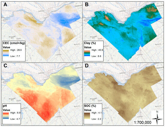 Random forest predictions of (A) cation exchange capacity (CEC), (B) clay content, (C) soil pH, and (D) soil organic carbon (SOC) for the Ottawa Study area using a sample plan created with conditioned Latin hypercube sampling and the overall optimal sample size of 865 sample locations.