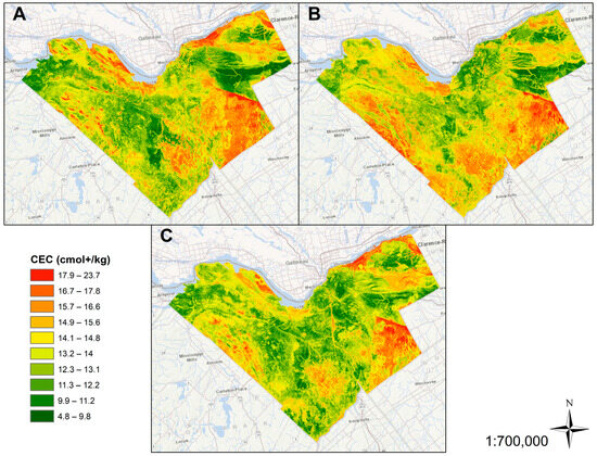 In general, the uncertainty maps show similar spatial patterns, regardless of the sampling algorithm used to select the optimal sample plan (Figure 7). The prediction interval maps for CEC are provided in Figure 7, while the maps for clay, pH, and SOC are provided in the Supplementary Materials (Figures S8–S10). The 90% prediction interval for CEC ranged from 5.8 to 23.7 cmol+/kg. Uncertainty was highest in the southeast corner of the map for all three sampling algorithms. This portion of the map has fine to moderately fine sediments of varying thickness overlying loamy, calcareous glacial till; the complex materials may contribute to the uncertainty. The prediction interval maps for the cLHS (Figure 7A) and the SRS (Figure 7C) sampling algorithms show higher uncertainty than the FSCS (Figure 7B) in the northern border of the map, which follows the Ottawa River. The median prediction interval widths were 13.5, 14.6, and 13.3 cmol+/kg for the cLHS, FCS, and SRS sampling algorithms, respectively. Based on the visual review and the median prediction intervals, there were no important differences. These trends are also apparent in the prediction interval maps for the other three soil properties (Figures S8–S10). It should be noted, however, that several studies have demonstrated that the use of ensemble modeling approaches can be leveraged to balance the outcomes of different machine learning algorithms [84,85,86]. Given some localized differences in the uncertainty of the predictions, an ensemble approach may be beneficial for this study area; however, this was out of the scope of the current research.
