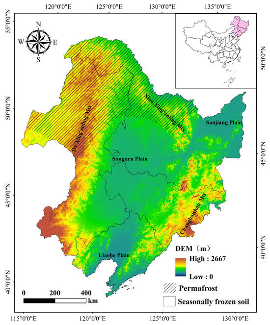 Northeast China is located between 115°3′–135°02′ E in longitude and 38°43′–53°36′ N in latitude, with a total area of 1,243,000 km2 [14] mainly encompassing the provinces of Heilongjiang, Jilin, and Liaoning, and the four leagues of Hulunbeier, Xing’an, Tongliao, and Chifeng in the eastern part of the Inner Mongolia Autonomous Region [15] (Figure 1). The region straddles mesothermal and cold temperate zones from south to north, with long, cold winters and warm, short summers; it is associated with complex and varied topography with the Changbai Mountains to the east, Xiao Xing’anling Mountains to the north, and Da Xing’anling Mountains to the west, and a vast plain in the center that shows an average elevation of less than 300 m above sea level [16]. The soil in the study area is particularly fertile and is important for commercial grain production. In recent years, significant warming, high climate variability, and frequent meteorological disasters in Northeast China have indicated that it is a typical climate-vulnerable area that is highly sensitive to the effects of climate warming. Northeastern China is located on the southern edge of the permafrost zone in the Eurasian continent and is the second-largest permafrost distribution area in China [17]. To better elucidate the frozen soil circumstances in the region, the “1:4 million Map of Snow, Ice, and Frozen Ground in China” released by National Cryosphere Desert Data Center (http://www.ncdc.ac.cn, accessed on 19 October 2023) [18], Northeast China was divided into permafrost and seasonally frozen soil zones.