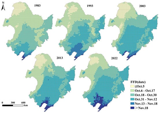 Significant spatial differences can be observed in the FFD over Northeast China (Figure 2), occurring mainly during October–November. The FFD occurs later from northwest to southeast, with freeze-thaw alternation starting in early October in the northern part of the Da Xing’anling Mountains, concentrated in mid-to-late October in Heilongjiang Province, and the latest freeze-thaw alternation usually in mid-to-late November in the Liaodong Peninsula area in the south. The time series data indicates that the area in which the FFD occurred before 5 October 1983 was mainly concentrated in the northern part of the Da Xing’anling Mountains, narrowing in 2022, whereas the FFD was mainly in Liaoning Province after 31 October 1983, with the gradual expansion northwards in 1993, followed by a further increase to the Sanjiang Plain and Changbai Mountain in 2022.