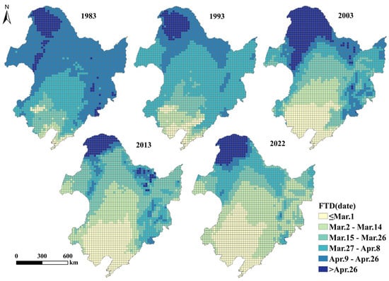 As can be seen from Figure 3, the FTD in Northeast China mainly occurs in March–April, with a gradual delay from south to north. The earliest occurrence is in late February in the southern part of the study area and at the end of April in the northern part of the Da Xing’anling Mountains. In addition to the influence of latitude, topography, and geomorphology play important roles. Northeast China is surrounded by the Da Xing’anling, Xiao Xing’anling Mountains, and the Changbai Mountains, and the central part of the region is a vast plain. Therefore, the FTD occurs significantly earlier on the Northeast Plain than in other regions at the same latitude. In terms of the time series, the FTD occurred after 27 March in the vast majority of Northeast China in 1983, narrowed significantly in 1993, and was observed only in the Da Xing’anling Mountains and Xiao Xing’anling Mountains and parts of the Changbai Mountains after 2013, whereas the area where the FTD occurs before March 1 expanded to the middle of the Northeast Plain.