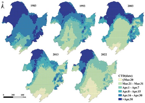 As shown in Figure 4, the CTD in the study area is also affected by latitude and topography, with the earliest occurrence in mid-to-late March in the southern part of the study area, April in the Changbai and Xiao Xing’anling Mountains, and mid-to-early May in the northern part of the Da Xing’anling Mountains. Similar to the FTD, the regional CTD occurred after April 16, 1983, except for Chifeng, eastern Tongliao, and parts of Liaoning and Jilin. The range narrowed significantly to the north in 1993 and, by 2022 could only be observed in scattered areas around the Da Xing’anling and eastern Changbai Mountains. In addition, the area where the CTD occurred before March 20 expanded northward from a sporadic occurrence in the Liaodong Peninsula to the Northeastern plains. In summary, the increases observed for areas where the FFD occurred later and the FTD and CTD occurred earlier indicated delayed soil freezing and earlier thawing.