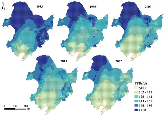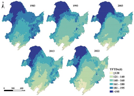 The spatial characteristics of the TFTDs and FPDs are similar (Figure 6), with the highest number of TFTDs reaching more than 195 days in the northern part of the study area and less than 120 days in certain southern areas. Significantly more TFTDs occurred at the southern end of the Da Xing’anling and Changbai Mountains than in the central plain at the same latitude. In the studied time series, only Liaodong Bay and the Liaodong Peninsula showed less than 140 TFTDs in 1983, and the range expanded to most of Liaoning Province in 1993 and the northern parts of the Northeast Plain and Sanjiang Plain region in 2022. Changes in regions with more than 195 TFTDs were relatively more subdued, and in general, the number of regions with shorter durations increased.
