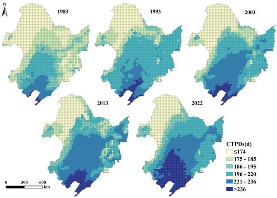 The spatial distribution of the CTPDs shows clear latitudinal and vertical zonality characteristics, with a gradual decreasing trend from southeast to northwest (Figure 7). Influenced by both latitude and altitude, the lowest number of CTPDs was observed in the northwestern part of the Da Xing’anling Mountains, with a minimum of less than 174 days, followed by the mountainous and hilly areas in the north, with more than 221 CTPDs observed in the central plains. In terms of the time series, generally fewer than 185 CTPDs occurred around Changbai Mountain in 1983, whereas 196–220 were observed in the same region in 2022. Areas with more than 221 days of the CTPDs were mainly located in the Liaodong Peninsula in 1983, and the range showing this number expanded to the northern part of the Songnen and Sanjiang plains in 2022.
