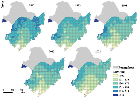 Under the influence of global warming, both MDSF and ALT have changed significantly. As shown in Figure 8, the spatial distribution of the MDSF in Northeast China varies significantly, with an overall decrease from north to south that is not exactly parallel to the latitude line and a relatively low freezing depth at the same latitude in the central plains. The high-value MDSF area is mainly distributed in the southwestern part of Hulunbeier, with an average of more than 214 cm, whereas low MDSFs are mainly distributed in Liaodong Bay and the Liaodong Peninsula, with an average of less than 100 cm and a minimum of less than 60 cm. From the time series, the area with an MDSF between 195 and 214 cm was mainly distributed south of the Da Xing’anling Mountains, north of Songnen Plain, and around the Xiao Xing’anling Mountains in 1983. This range narrowed significantly in 1993 and almost disappeared after 2013, while the area with an MDSF between 101 cm and 135 cm expanded significantly.