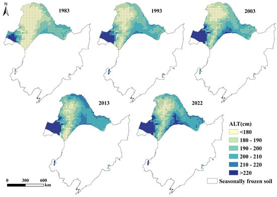 In areas of continuous permafrost, where the active layer is underlain by articulated permafrost, the ALT is usually considered the maximum depth of seasonal thawing [3,37]. The area of shallow depth of seasonal thawing in Northeast China is mainly located in the Da Xing’anling Mountains (Figure 9), which is generally less than 180 cm; where extensive permafrost is distributed, DEM is high, and annual temperatures are low. The maximum depths of seasonal thawing values are higher on the south side of the Hulunbeier and Xiao Xing’anling Mountains, up to more than 220 cm. From the time series, the maximum depth of seasonal thawing showed an increasing trend from 1983 to 2022, with a significant expansion of the area in which it reached to a depth of more than a 200 cm, whereas the area in Da Xing’anling Mountains with the maximum depth of seasonal thawing of less than 180 cm was significantly smaller.