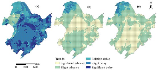 The Mann–Kendall test was used to judge the significance of the trend. With reference to previous studies [34], trend significance judgment was carried out at a 0.05 confidence level (|Z| ≥ 1.96). Combined with the trend analysis results, the results were classified into five trend change levels: significant decrease (advance) (slope < −0.0005,|Z| ≥ 1.96), slight decrease (advance) (slope < −0.0005, |Z| < 1.96), relative stability (|slope| < 0.0005,|Z| < 1.96), slight increase (delay) (slope > 0.0005, |Z| < 1.96), and significant increase (delay) (slope > 0.0005,|Z| ≥ 1.96). Further details concerning the basic principle calculation formula can be found in the existing literature [35].