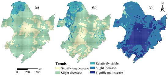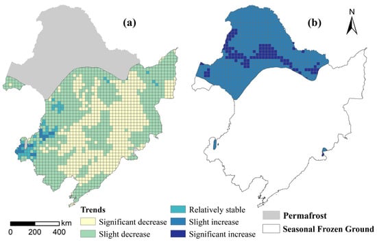 The depth of the ALT increased by approximately 22 cm from 1983 to 2022 in Northeast China, mainly at 5.49 cm/10 a. As shown in Figure 12b, a significantly increased ALT is mainly distributed in the northwestern part of the Da Xing’anling and the Xiao Xing’anling Mountains, accounting for 15.9% of the total area. The area of slight increase is widely distributed and accounts for 84.1%of the total.
