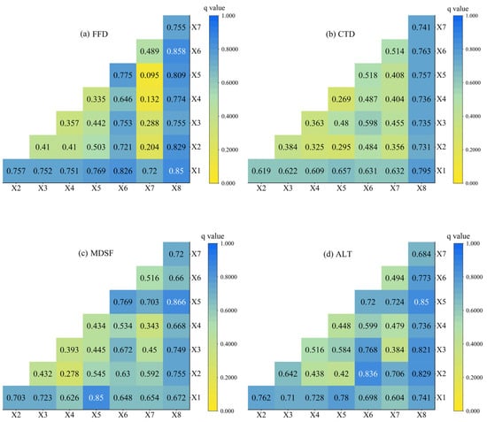 The magnitude of a factor detector, which is used to detect the spatial dissimilarity of the dependent variable Y and the influence of factor X on the spatial distribution of the dependent variable Y, can be measured using a q-value (0 ≤ q ≤ 1) [36], with a q value close to 1 indicating greater influence for a particular factor.
