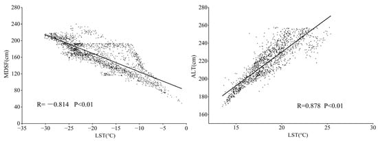 As soil temperature located at 0 cm has a direct effect on MDSF and ALT, in order to assess the reliability of the MDSF and ALT simulations, this study used LST data to validate the simulation results. As shown in Figure 14, there was a significant correlation between LST and MDSF with a correlation coefficient of R = −0.814 (p < 0.01). LST was likewise significantly correlated with ALT with a correlation coefficient of R = 0.878 (p < 0.01). Therefore, the results indicate that the simulation results for MDSF and ALT are sufficiently reliable.
