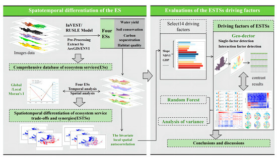 The excessive utilization of natural resources and the natural environment in the group has increased human demand for ecosystem services (ESs) [1]. As one of the critical components in ecosystem assessment, ESs have garnered increasing attention in ecology [2]. Because good ESs will bring more benefits to the human living environment. Some common ESs include soil and water conservation and biodiversity maintenance. However, the relationship among various ESs is typically defined by synergistic interactions and trade-offs [3,4]. ES synergy is when two types of ESs change in the same direction, while the ES trade-off is when two types of ESs change in opposite directions [5]. Therefore, clarifying the trade-off/synergy relationships between the different ESs as well as further detecting their driving factors help promote ecological civilization construction and attain a “win-win” situation between business growth and ecological preservation [6].