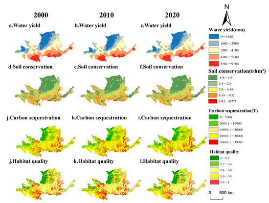 Figure 3a–c show that the water yield represented a spatial pattern with highs in the south and lows in the northwest. The water yield volume decreased during 2000–2020 (see Table 3). Specifically, the regions with high water yield values were mainly focused on the southern part of the Weihe River Valley and the southeast of the Tibetan Plateau. The regions with low water yield values were mainly focused on the border area between the Loess Plateau and Alashan Plateau. In addition, water yield services formed a small-scale, low-value agglomeration area in the northwest of Qinghai.