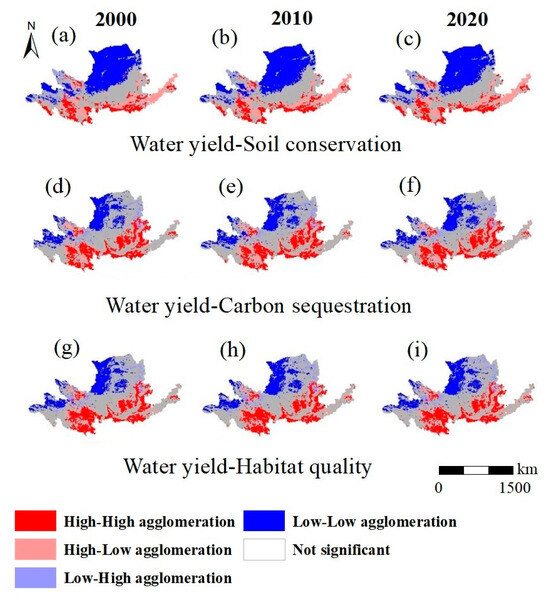 The spatial pattern changes in WY-H of ESTSs were mainly manifested as the expansions of synergy and trade-off zones during 2000–2020 (Figure 4g–i and Figure 6c). The synergy zones between WY-H were mainly focused on the southeast of the Tibetan Plateau, the Fenwei Valley, and the junction of the Inner Mongolia Plateau and the Loess Plateau. The trade-off zones were mainly focused on the Huangshui Valley, the Fenhe Valley Basin, and the lower reaches of the Yellow River Basin. Among them, the high–high synergy zones were concentrated in the Fenwei Valley. The low–low synergy zones were focused on the junctions of the Loess Plateau, the Inner Mongolia Plateau, and the Alashan Plateau. Whereas the high–low trade-off zones were focused on the southeast of the Tibetan Plateau, there are also a few isolated areas of high–low trade-off zones in Henan province. The low–high trade-off zones concentrated on the eastern part of the Inner Mongolia Plateau, Huangshui Valley in Qinghai. In addition, there was sporadic distribution in the plains of the lower Yellow River.