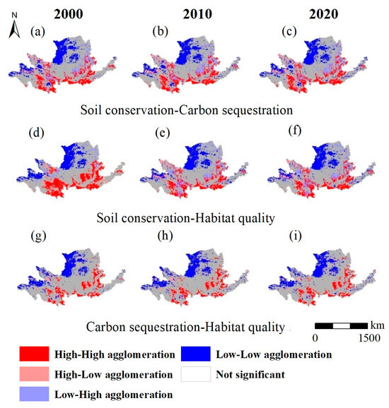 The spatial pattern of WY-C of ESTSs was mainly manifested as the expansions of the synergy and trade-off zones during 2000–2020 (Figure 4d–f and Figure 6b). The synergistic relationship between WY-C was mainly focused on the Fenwei Valley, the southeast of the Tibetan Plateau, and the junction of the Inner Mongolia Plateau and the Loess Plateau. The trade-off zones were mainly along the Huangshui Valley and the Fenhe Valley. Among them, the high–high synergy zones were focused on the Fenwei Valley and the southeast of the Tibetan Plateau. The low–low synergy zone was mainly concentrated at the junction of the Loess Plateau and the Alashan Plateau. Whereas the high–low trade-off zones were focused on Qinghai Province and the low–high trade-off zones were sporadically distributed in Inner Mongolia province, Gansu province, and Helan and Ningxia.