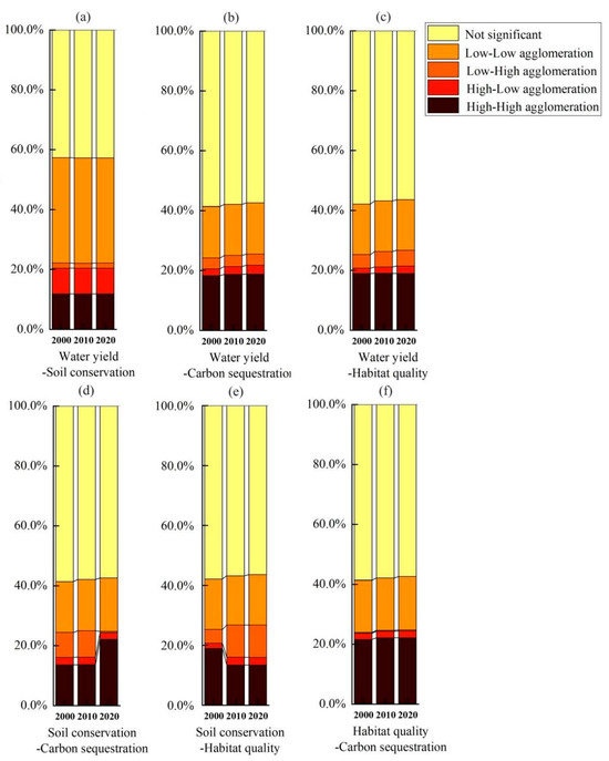 The percentages of ESTS areas and their changes from 2000 to 2020. (a) The percentage of Water yield- Soil conservation ESTS area in 2000–2020; (b) The percentage of Water yield - Carbon sequestration ESTS area in 2000–2020; (c) The percentage of Water yield- Habitat quality ESTS area in 2000–2020; (d) The percentage of Soil conservation - Carbon sequestration ESTS area in 2000–2020; (e) The percentage of Soil conservation - Habitat quality ESTS area in 2000–2020; and (f) The percentage of Habitat quality - Carbon sequestration ESTS area in 2000–2020.